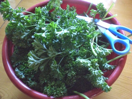 (A little glitch, I made a mistake by not mulching around the plants. With all our rain, the parsley got fairly splattered with mud and required repeated washings to get it clean.)