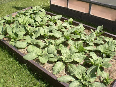 A whole 4' x 8' raised bed was planted to borage because it's supposed to be a good plant for honey bees. This area is not farm country (understatement of the day) so we don't have fields of blossoms from which our bees can collect nectar. They have to make do with any wild flowers or cultivated blossoming plants they can find. These borage plants should grow 18" to 30" tall so even though they're looking good they have a ways to go before producing their showy blue flowers.